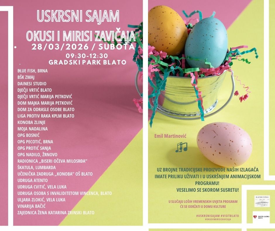 Tematska gastro manifestacija „Okusi mirisi zavičaja – Uskrsni sajam u Blatu“ tradicionalno se održava u subotu uoči Cvjetnice, stoga vas i ove godine očekujemo 28.ožujka(subota) od 9:30 do 12:30 sati u Gradskom parku u Blatu.