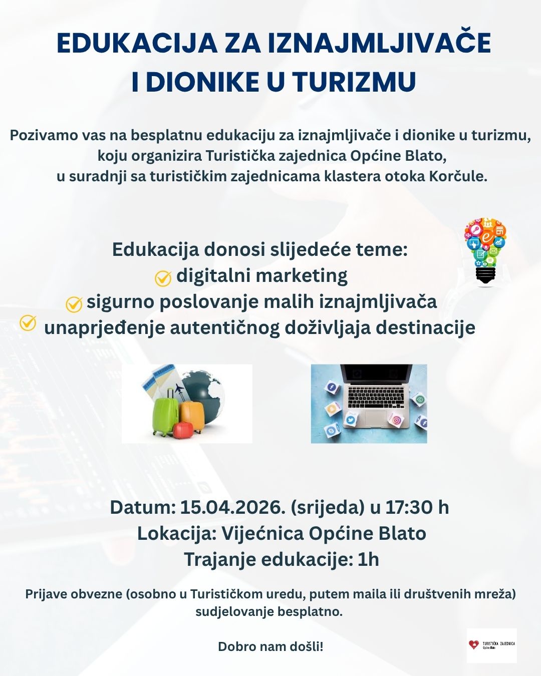 Pozivamo vas na besplatnu edukaciju za iznajmljivače i dionike u turizmu, koju organizira Turistička zajednica Općine Blato, u suradnji sa turističkim zajednicama klastera otoka Korčule.