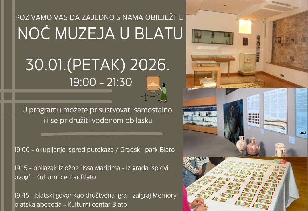 Pozivamo vas da zajedno s nama obilježite NOĆ MUZEJA u Blatu 30.01. (petak) 2026. 19:00-21:30.