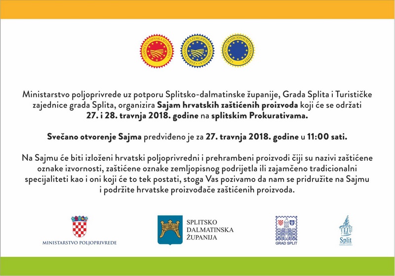 Dana 27. i 28. travnja 2018. na splitskim Prokurativama održavao se Sajam hrvatskih zaštićenih proizvoda u organizaciji Ministarstva poljoprivrede, a uz potporu Splitsko-dalmatinske županije, Grada Splita i Turističke zajednice grada Splita.
