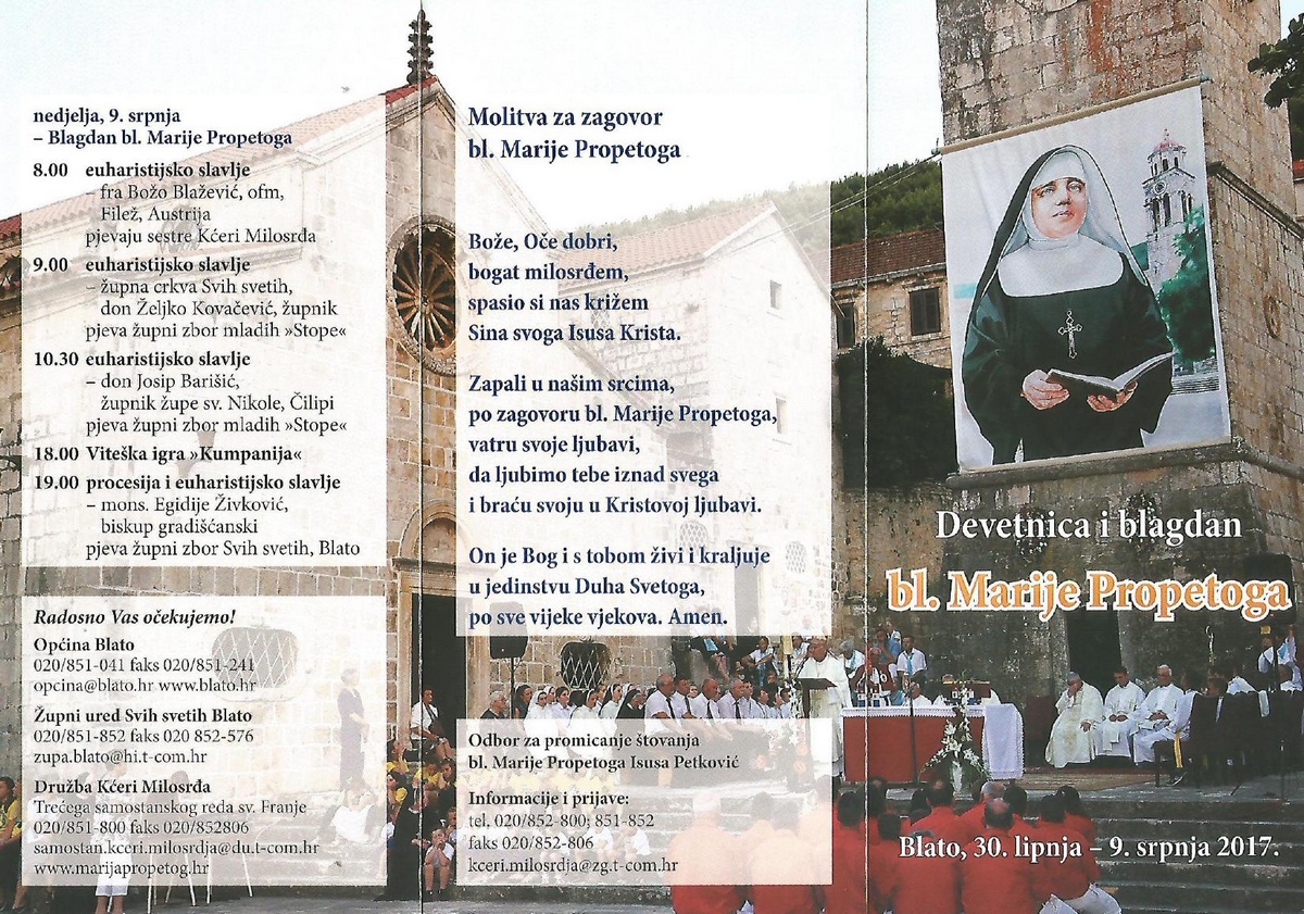 U Blatu na Korčuli 30. lipnja do 9.srpnja započinje devetnica pred blagdan bl. Marije Propetog Isusa Petković. Devetnica će se odvijati u njezinom svetištu koje se nalazi u sklopu samostana Družbe Kćeri Milosrđa TSR sv. Franje.