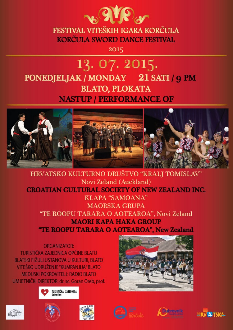 U okviru programa Viteških igara otoka Korčule 13. srpnja sa početkom u 21:00 sat na blatskoj plokati održati će se nastup Hrvatskog kulturnog društva "Kralj Tomislav", Novi Zeland ( Auckland), "Te Roopu Tarara O Aotearoa" i klapa "Samoana". Folklorni nastup Hrvata, Maora i Samoanaca sa Novog Zelanda prikazuje kako se isprepleću tradicije domicilnih Maora sa tradicijama useljenika. Ova sinergija prikazuje kako je hrvatska kultura prihvaćena u suživotu sa pripadnicima drugih kultura i civilizacija u najudaljenijoj zemlji.