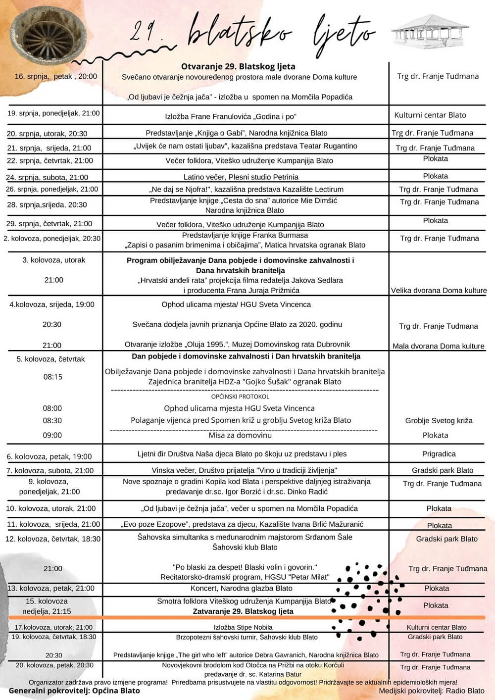 Svi programi bit će najavljivani na našim društvenim mrežama, stranicama Ustanove www.blatski-fizuli.hr i u eteru Radio Blata, a bit će tu i plakata da Vas podsjete na programe.