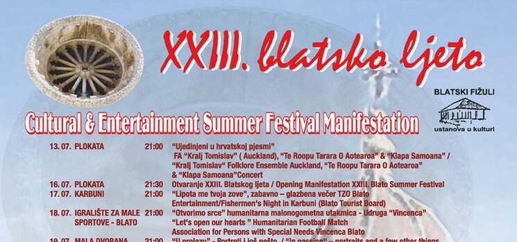 16. srpnja, četvrtak u 21:30 Otvaranje XXIII. Blatskog ljeta, 17. srpnja, petak u 21:00 "Lipota me tvoja zove" zabavno – glazbena večer, Karbuni...