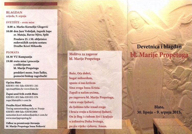 Odbor za promicanje štovanja bl. Marije Petković u suradnji sa župnim uredom Svih svetih Blato, Družbom Kćeri Milosrđa i Općinom Blato priredilo je program devetnice u čast bl. Marije Propetoga od 30. lipnja do 9. srpnja 2015. godine.