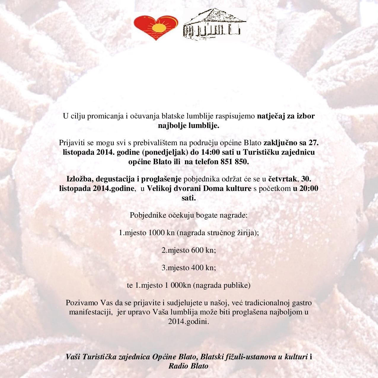 U cilju promicanja i očuvanja blatske lumblije raspisujemo natječaj za izbor najbolje lumblije. Prijaviti se mogu svi s prebivalištem na području općine Blato zaključno sa 27. listopada