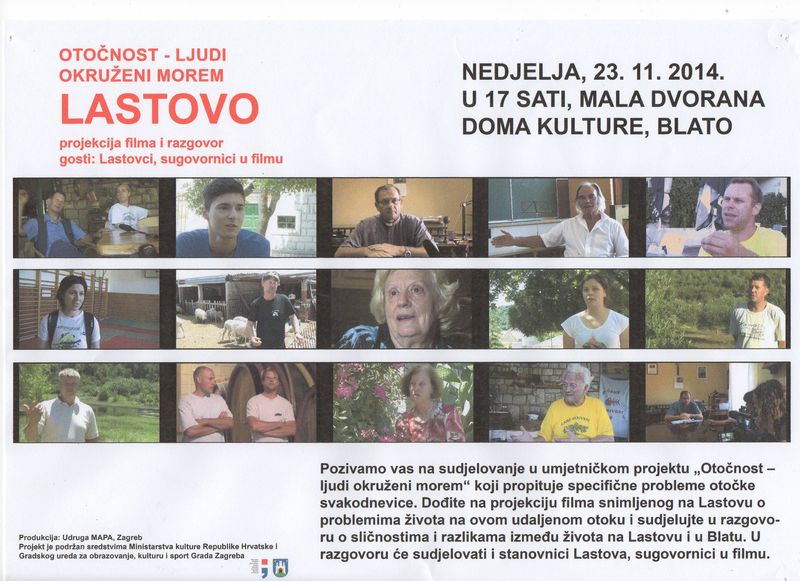 Pozivamo Vas na sudjelovanje u umjetničkom projektu "Otočnost - ljudi okruženi morem" koji propituje specifične probleme i unutarnje procese otočke svakodnevnice, nedjelja, 23. 11. 2014. u 17:00 sati, mala dvorana Doma kulture, Blato. Dođite na projekciju filma snimljenog na Lastovu o problemima života na ovom udaljenom otoku i sudjelujte u razgovoru o sličnostima i razlikama između života na Lastovu i u Blatu.