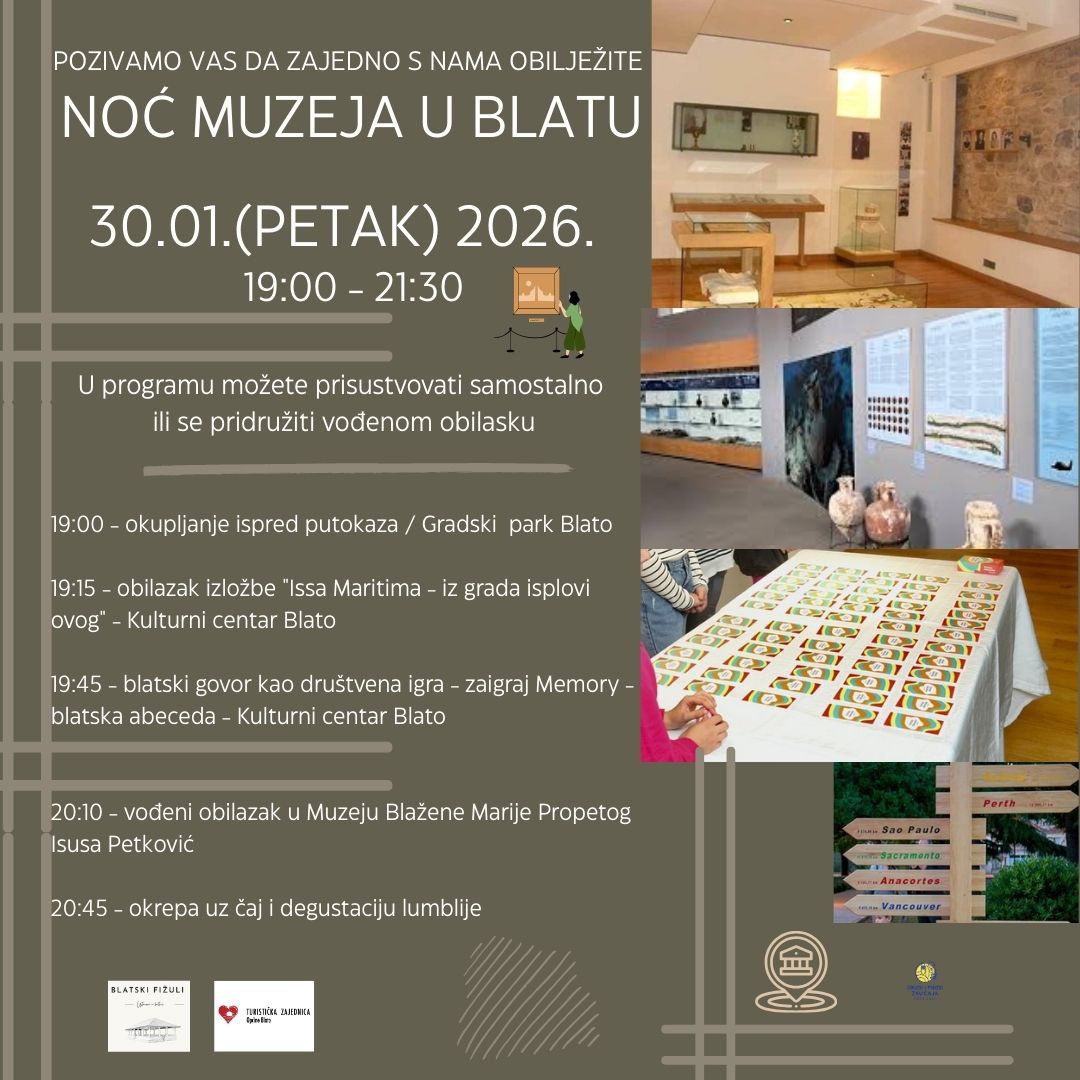 Pozivamo vas da zajedno s nama obilježite NOĆ MUZEJA u Blatu 30.01. (petak) 2026. 19:00-21:30.