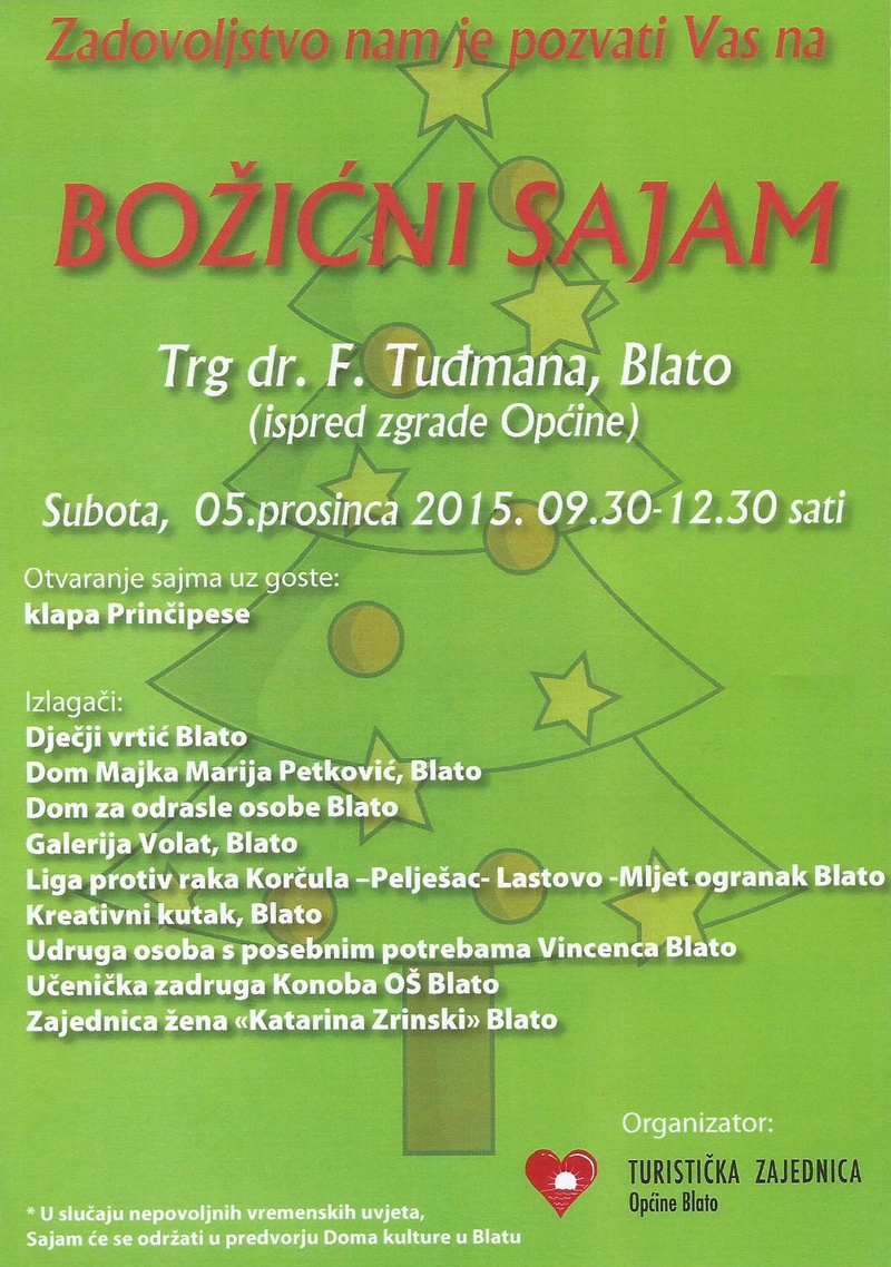 * U slučaju nepovoljnih vremenskih uvjeta, Sajam će se održati u predvorju Doma kulture u Blatu