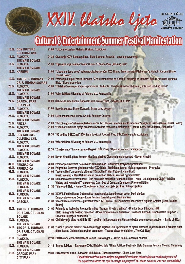 Program XXIV. blatskog ljeta započinje svečanim otvaranjem 16. srpnja na Plokati. Tradicionalna ljetna kulturna manifestacija i ove godine nudi raznolik i bogat kulturni te zabavni program koji obuhvaća folklorni i dramski program, promocije, izložbe, koncerte, te Festival klapa Dubrovačko-neretvanske županije, rekonstrukciju povijesne bitke na Giči iz 1571. godine, Smotru blatskog folklora te zabavne večeri po prekrasnim uvalama naše Općine.