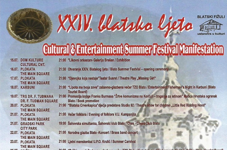 Program XXIV. blatskog ljeta započinje svečanim otvaranjem 16. srpnja na Plokati. Tradicionalna ljetna kulturna manifestacija i ove godine nudi raznolik i bogat kulturni te zabavni program koji obuhvaća folklorni i dramski program...