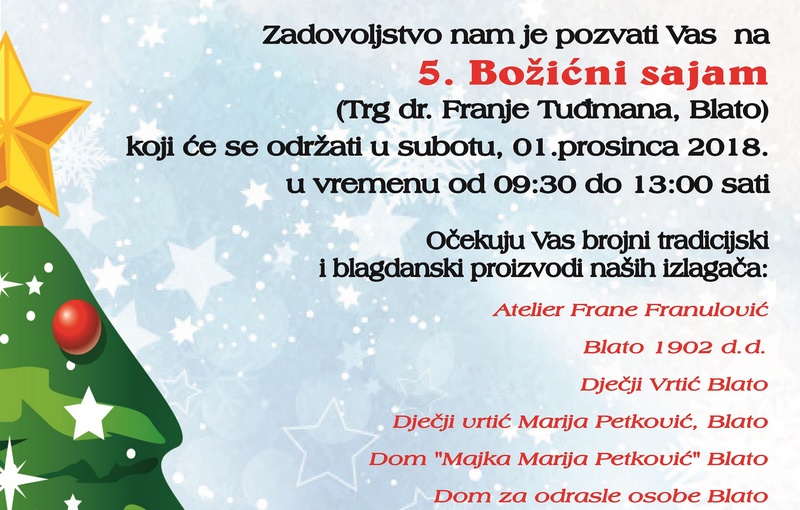 Zadovoljstvo nam je pozvati Vas na 5. Božićni sajam (Trg dr. Franje Tuđmana, Blato) koji će se održati u subotu, 01. prosinca 2018. u vremenu od 09:30 do 13:00 sati