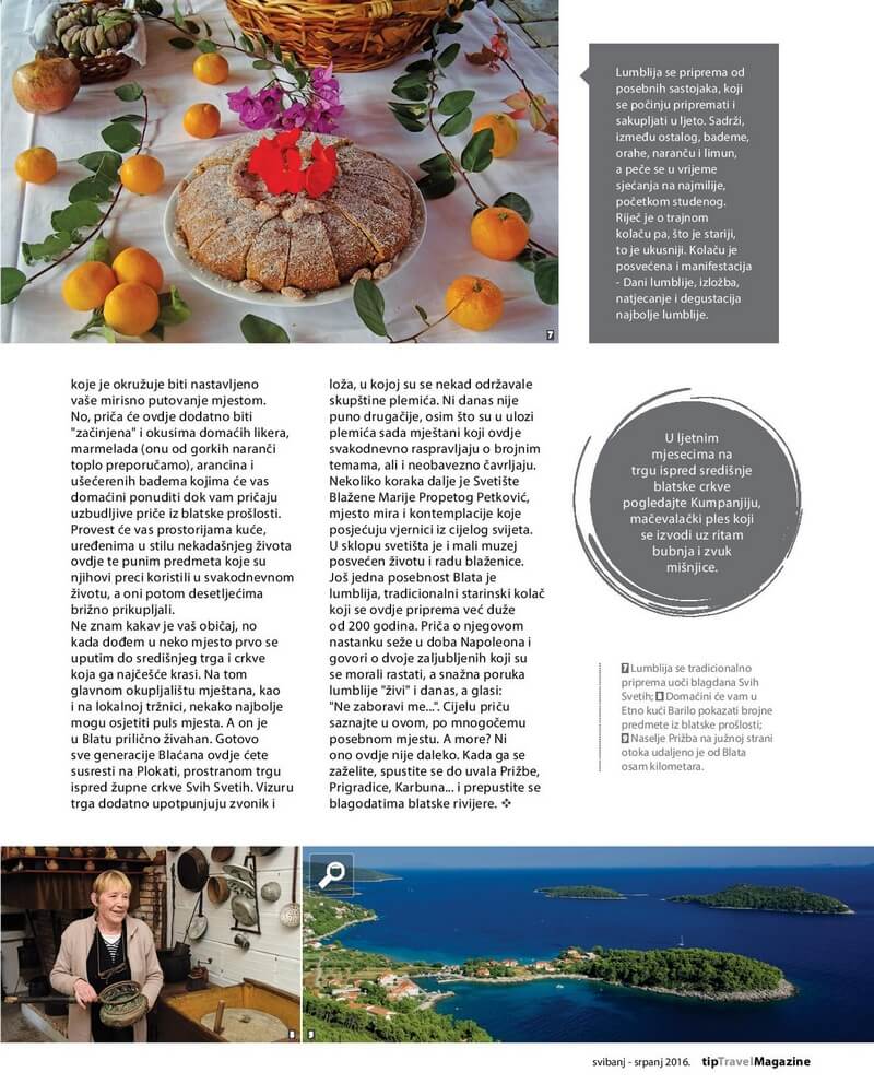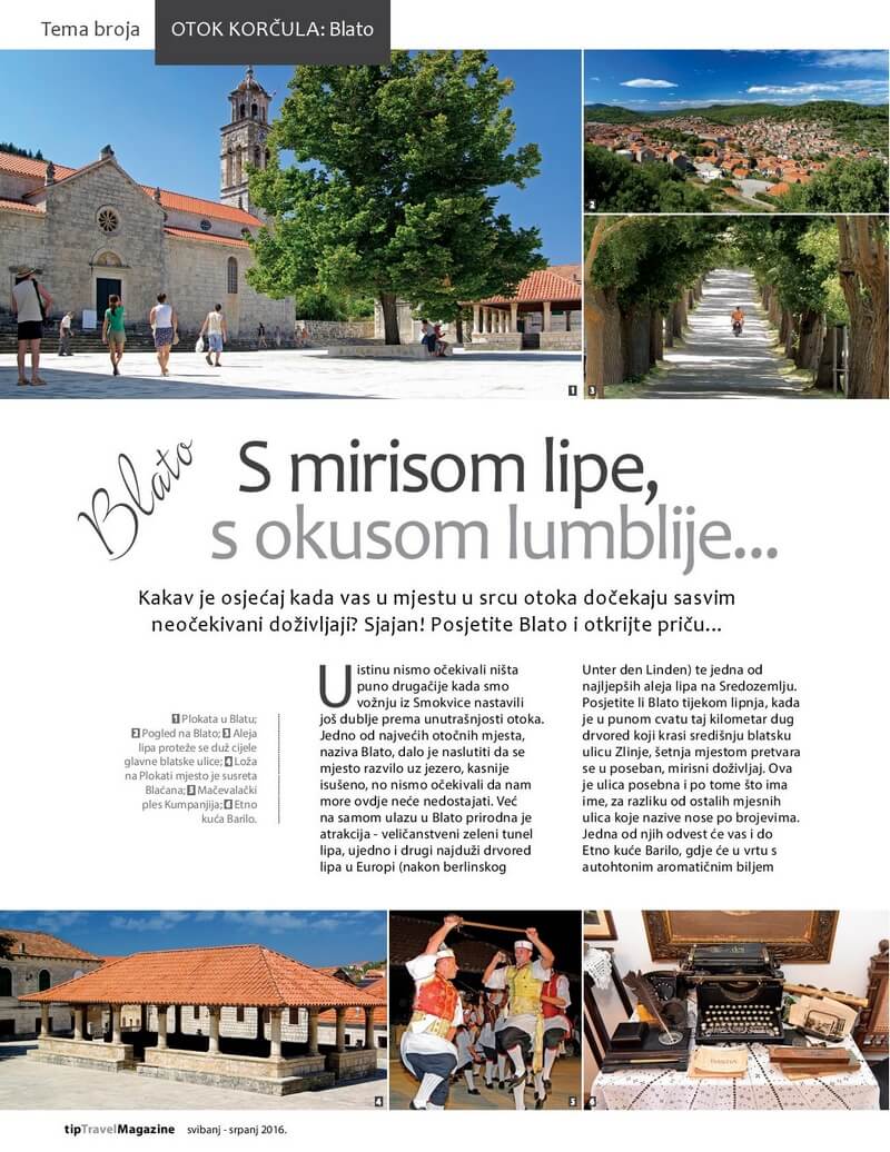 TIP TRAVEL MAGAZINE, prvi hrvatski digitalni i interaktivni online magazine o turizmu i putovanjima, čitan u više od 120 zemalja svijeta donosi otok Korčulu kao glavnu temu broja svibanj-srpanj 2016 pa su tako predstavljene atrakcije, turistička ponuda i niz doživljaja koje turistima i svim posjetiteljima otoka nudi Blato zajedno sa Lumbardom, Smokvicom, Velom Lukom i gradom Korčulom.